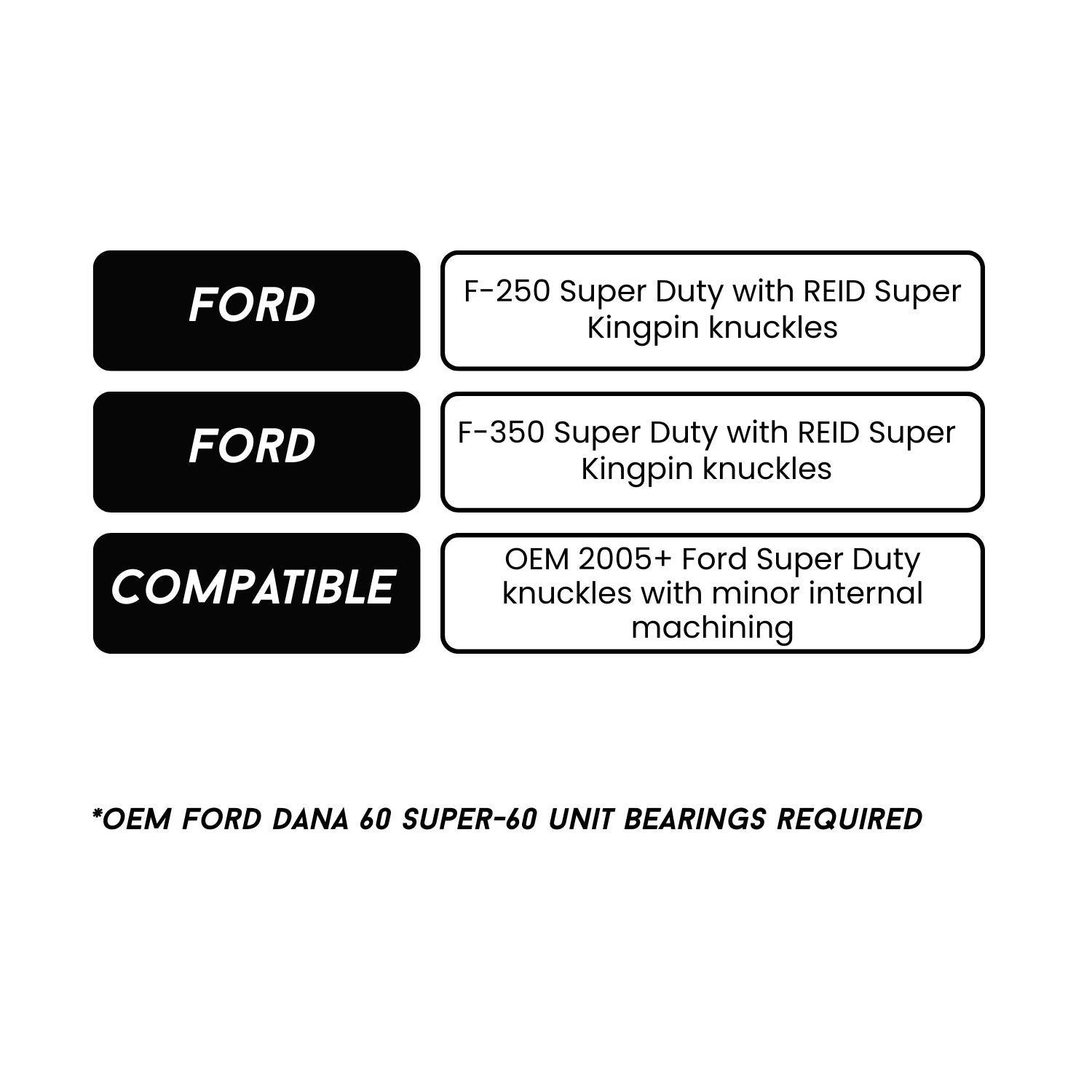 - Will also fit OEM 2005+ Ford Super Duty knuckles with minor internal machining