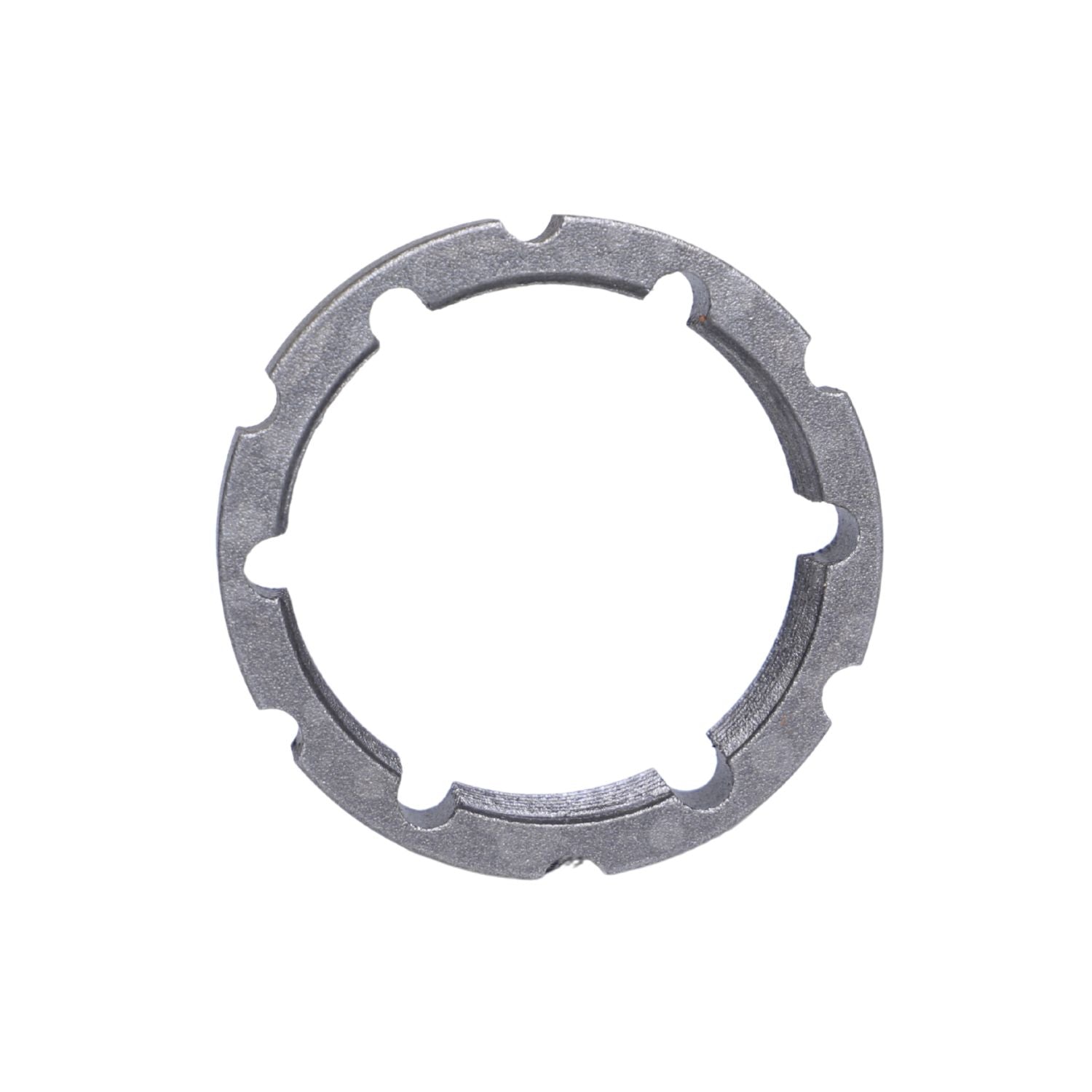 The spindle nut threads onto the 40-spline spindle to set the correct bearing preload. Internal grooves align with a keyway on the spindle, and a dowel or roll pin passes through a keeper and the spindle to securely lock the assembly after the proper preload is achieved.